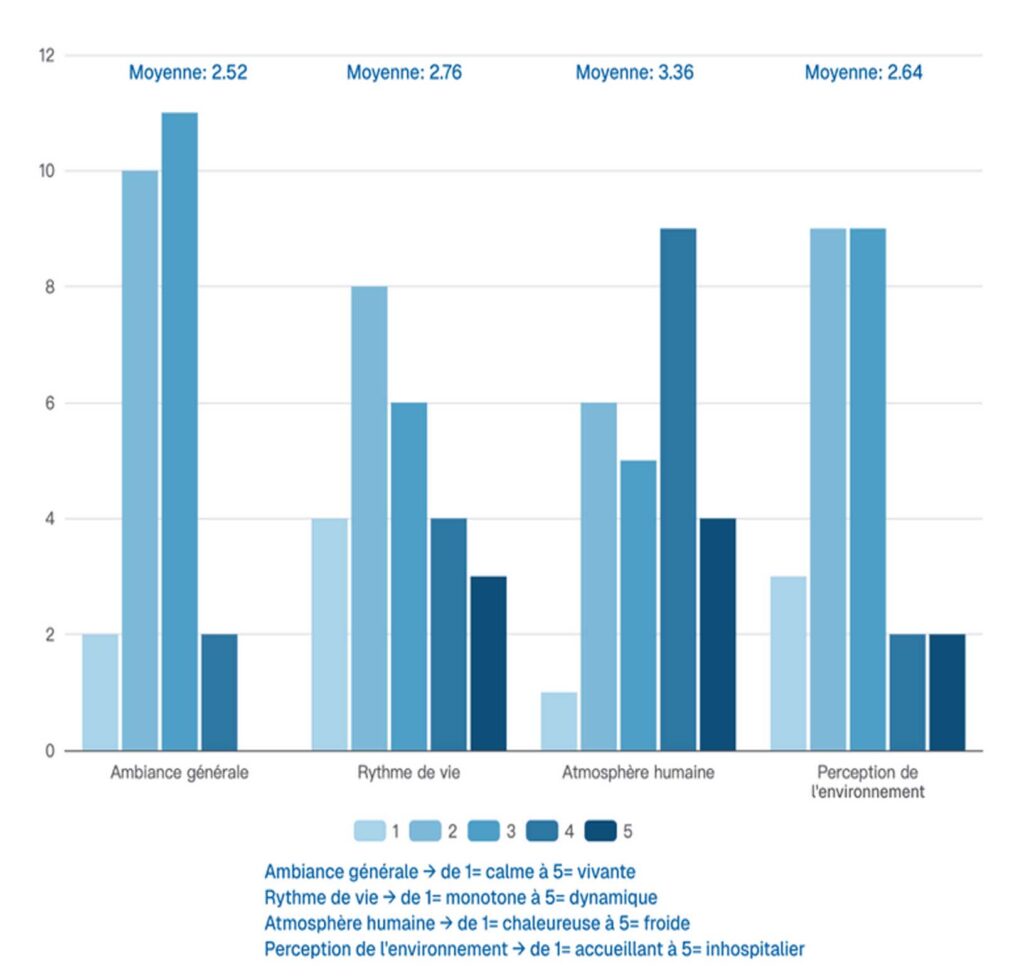 Les résultats montrent que la perception de la vie quotidienne sur le Plateau de Saclay est globalement neutre ou légèrement négative. L’atmosphère humaine est perçue comme plutôt froide, traduisant un manque de liens sociaux dans la vie de tous les jours. Le rythme de vie, jugé monotone, confirme l’image d’un lieu avant tout académique et fonctionnel, où la communauté peine à produire la vitalité nécessaire pour créer une ambiance véritablement animée. Cependant, l’environnement est perçu comme légèrement accueillant, ce qui nuance l’ensemble et contribue à maintenir une impression générale de neutralité plutôt que de rejet.