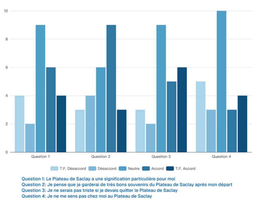Ces affirmations se retrouvent chez les étudiants internationaux. Concernant le sentiment d’appartenance, les apprenants interrogés n’ont pas l’impression de faire partie de cet endroit. Au-delà des différences culturelles, ils n’ont pas le sentiment d’appartenir au Plateau de Saclay. Seule une minorité possède un « faux sentiment d’appartenance » lié au fait que c’est leur première expérience de vie à l’étranger. La perception de la situation actuelle est simplement résumée ainsi : désolation, oppression et manque de praticité. Aux yeux des étudiants internationaux, cette zone est totalement “inhabitable”. Un ingénieur a notamment souligné le côté « oppressant » et « désorganisé », ainsi qu’un manque de « souffle de vie ». Ce qui est mentionné de manière récurrente, c’est le manque total d’infrastructures de base pour la vie quotidienne : manque sévère d’installations de loisirs, transports peu pratiques, et absence de centres commerciaux pour répondre aux besoins diversifiés des étudiants.