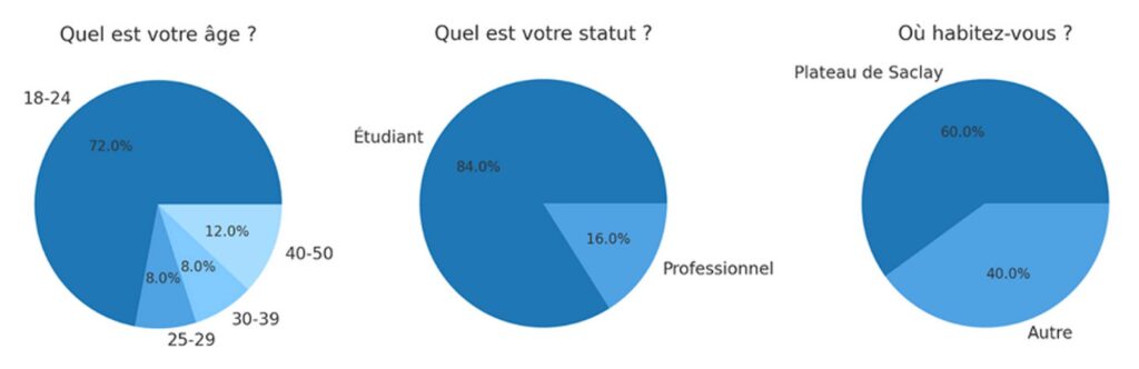 Étant donné que l’échantillon est fortement concentré sur un groupe jeune, très mobile et centré sur les activités académiques, la portée de nos résultats doit être précisée. Notre analyse reflète principalement la perspective, les attentes et les difficultés perçues par les usagers du campus, en particulier les étudiants du Plateau de Saclay, qui représentent 84% des répondants bien que nous ayons tenté de contacter des associations de riverains. Leur participation aurait pu contribuer à observer des récurrences sur un échantillon plus représentatif de l’ensemble de la population du plateau.