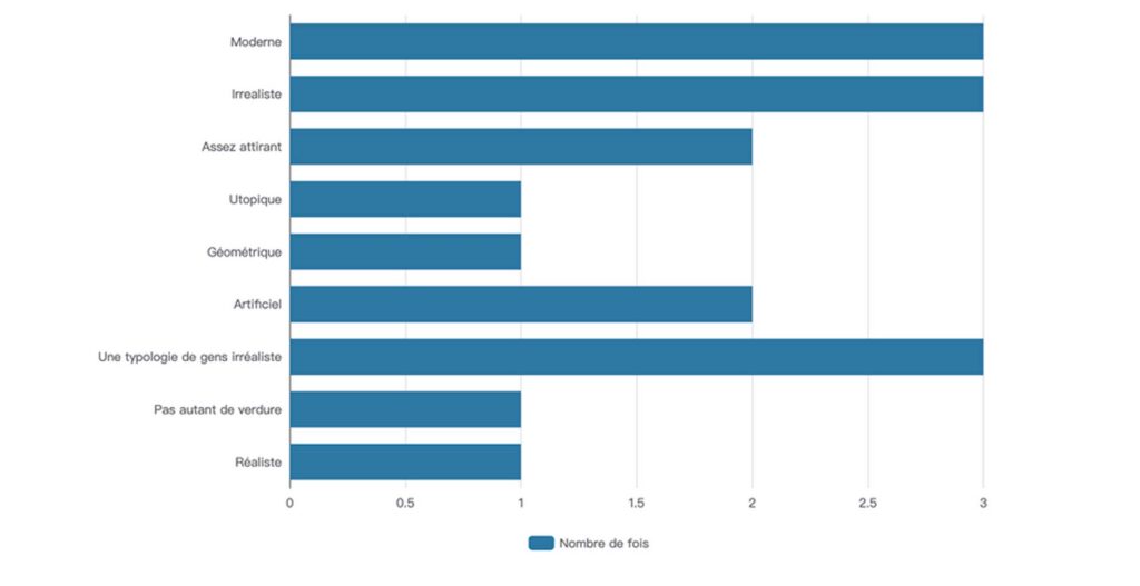 Concernant les personnes francophones, malgré quelques oppositions, les points de vue convergent. Ils associent aux prospectives une vision irréaliste du plateau. Plusieurs se sont basés sur ce qu’ils avaient déjà vu sur les prospectives des autres quartiers, tel que Moulon, pour l’affirmer. Sur la fig, 4, vous pouvez observer les principaux mots associés aux images.Ainsi, eux ont évoqué pour un futur plus adapté uniquement des espaces et infrastructures pour se réunir en dehors de la sphère scolaire. Ils ont décrit une volonté de faire des ponts entre toutes les personnes sur la plateau, notamment entre les écoles. Les étudiants ont évoqué une frustration à ne jamais être en contact avec les autres étudiants. Cependant, alors que les interviewés se sont largement opposés aux prospectives montrées, on s’aperçoit à la lecture des communiqués institutionnels, sur le site de l’EPA par exemple (https://epa-paris-saclay.fr/le-territoire/campus-urbain-orsay/quartier-de-corbeville/), que leurs intentions sont similaires. Celles-ci décrivent pour le futur du Plateau, “Une ville nature et résiliente” et veulent le développement d’une grande lisière comme paysage utile et amplification de la géographie du coteau boisé. Ils évoquent aussi “Une ville des proximités” et visent à réduire l’usage de la voiture, mais aussi un “ complexe sportif universitaire” visant à créer de la vie sociale. Enfin, ils mettent en avant “Le futur Hôpital Paris-Saclay”, décrit comme apportant une démarche de soins d’excellence. Ainsi, les volontés émises par les institutions sont en réalité semblables à celles des usagers.